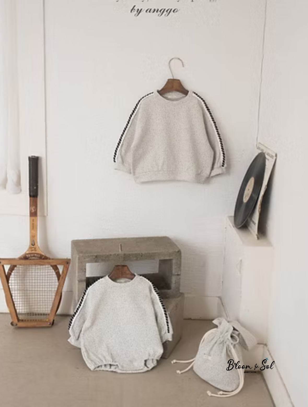 スウェット生地よりもサラサラでお肌に優しい素材のロンパース。男女問わず着用でき、肩から袖にかけて入るラインがおしゃれさをアップしてくれています♪
